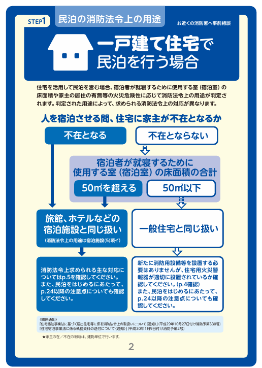 一戸建て住宅で民泊を行う場合でも、すべてが消防法令上は宿泊施設扱いになるわけではありません。消防法令上は、建物の構造や規模、民泊として使用する範囲などを踏まえて用途が判断されます。
