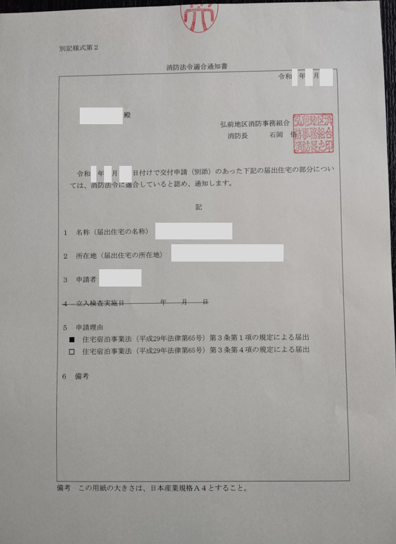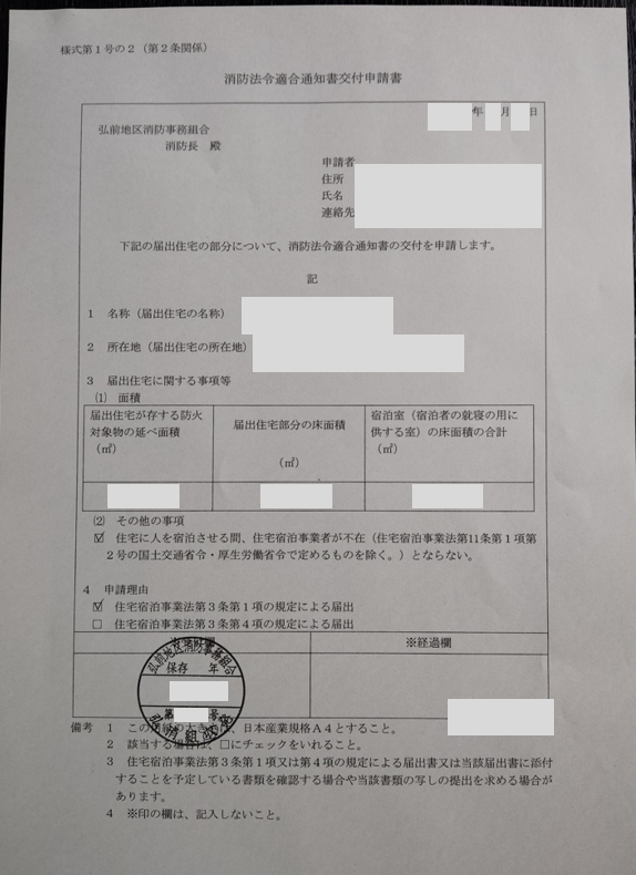 今回の申請は住宅宿泊事業(家主常駐型)として営業するためのものです。住宅宿泊事業法に基づく届出には、消防法令適合通知書の交付申請が必要になります。