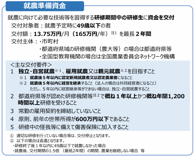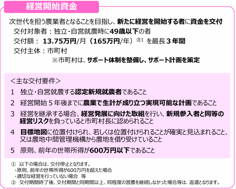 農林水産省「新規就農者向け支援(就農準備資金・経営開始資金)」